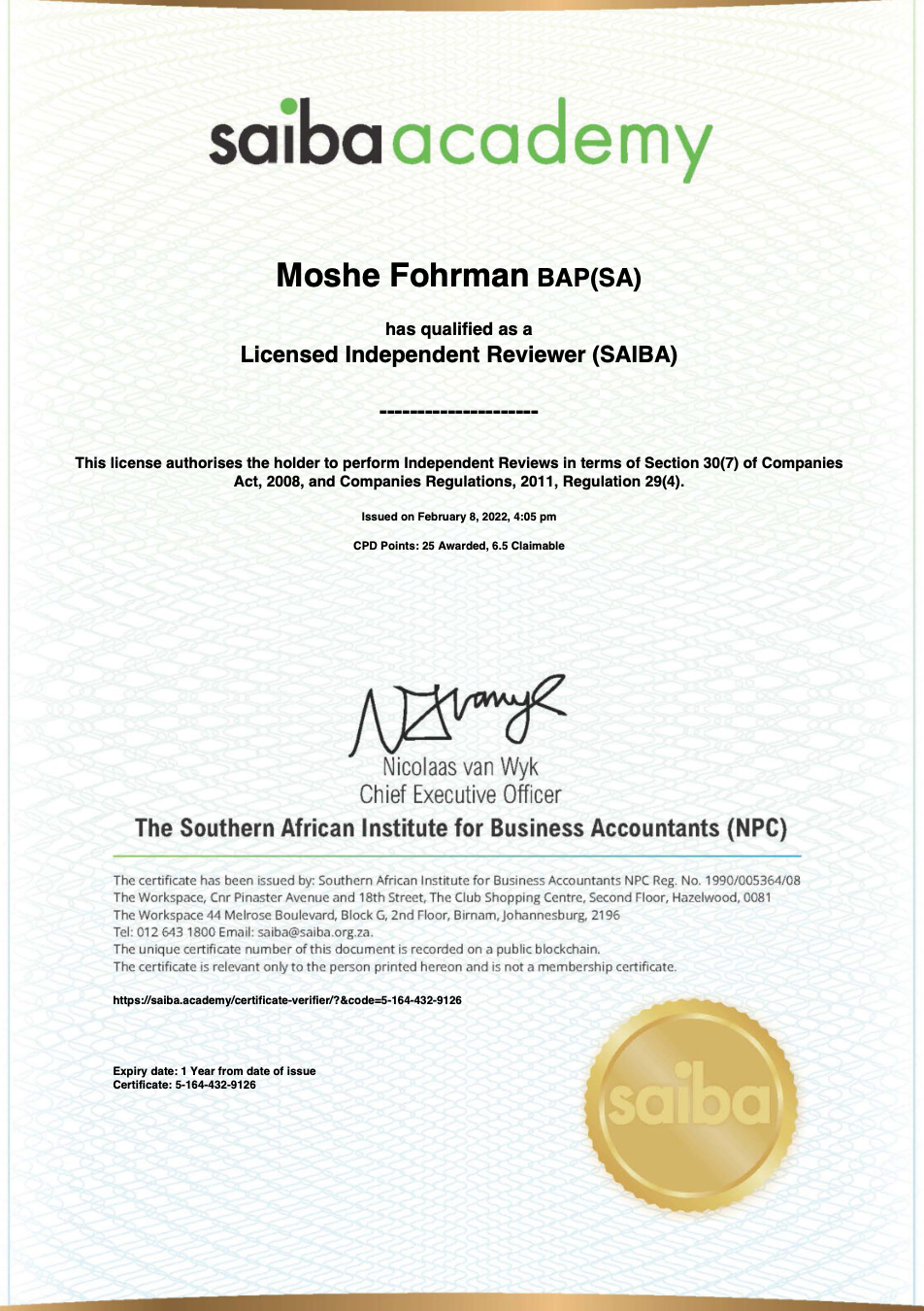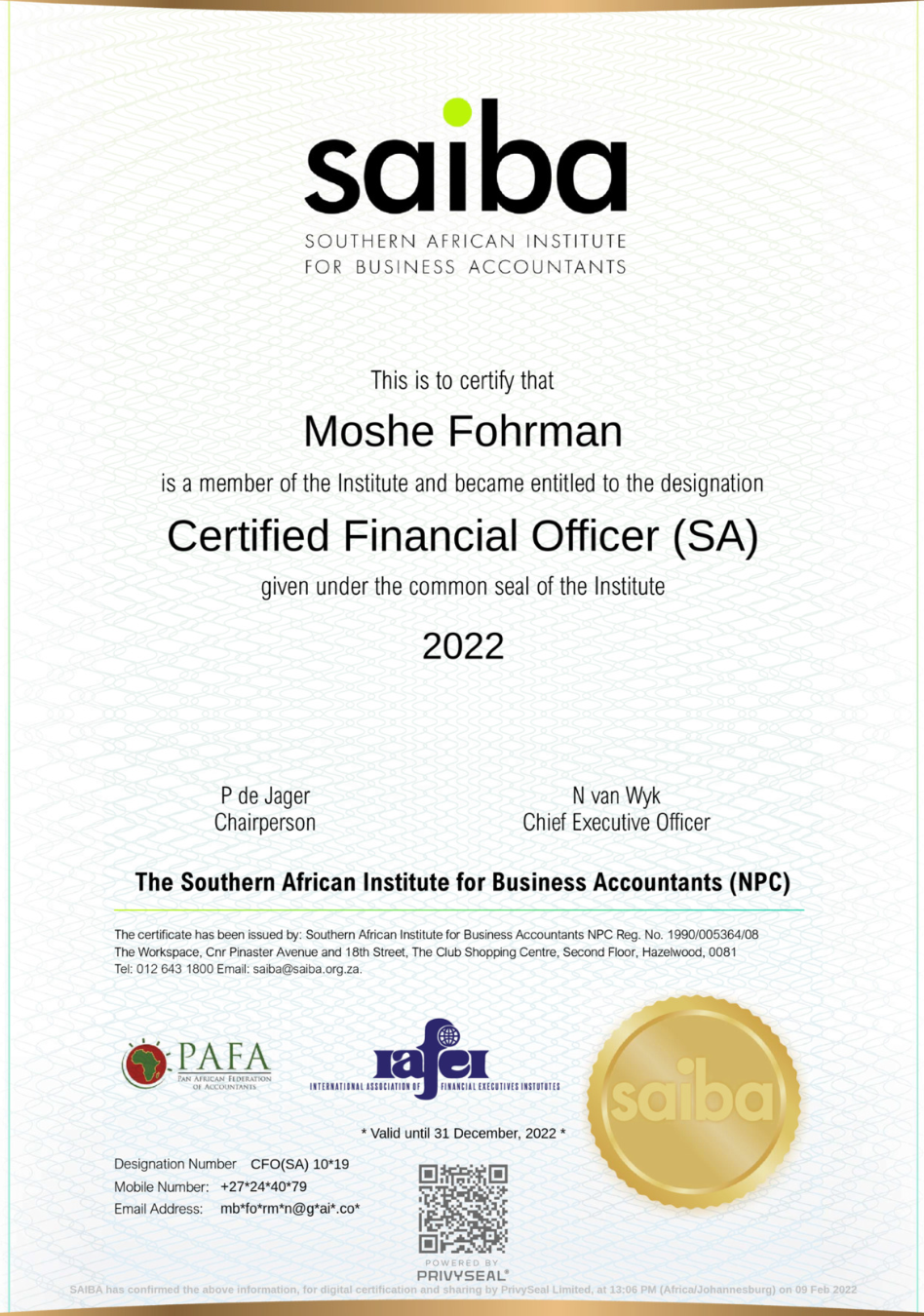 Moshe is qualified Business accountant in practice, and hold both SAIBA license (South African institute of business accountant) and SAIT License (South African Institute of Tax professionals). In addition he holds a H Dip in Taxation from (Unisa).